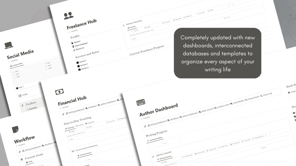 Designed to be a one-stop shop, this template seamlessly organizes every aspect of your writing career; from outlining and drafting to finally publishing and marketing; from drafting a newsletter incentive to social media promotion and freelance work. This updated writing dashboard has everything you'll need!